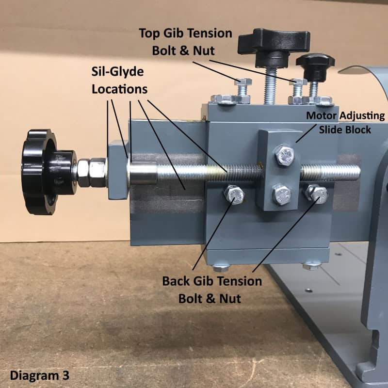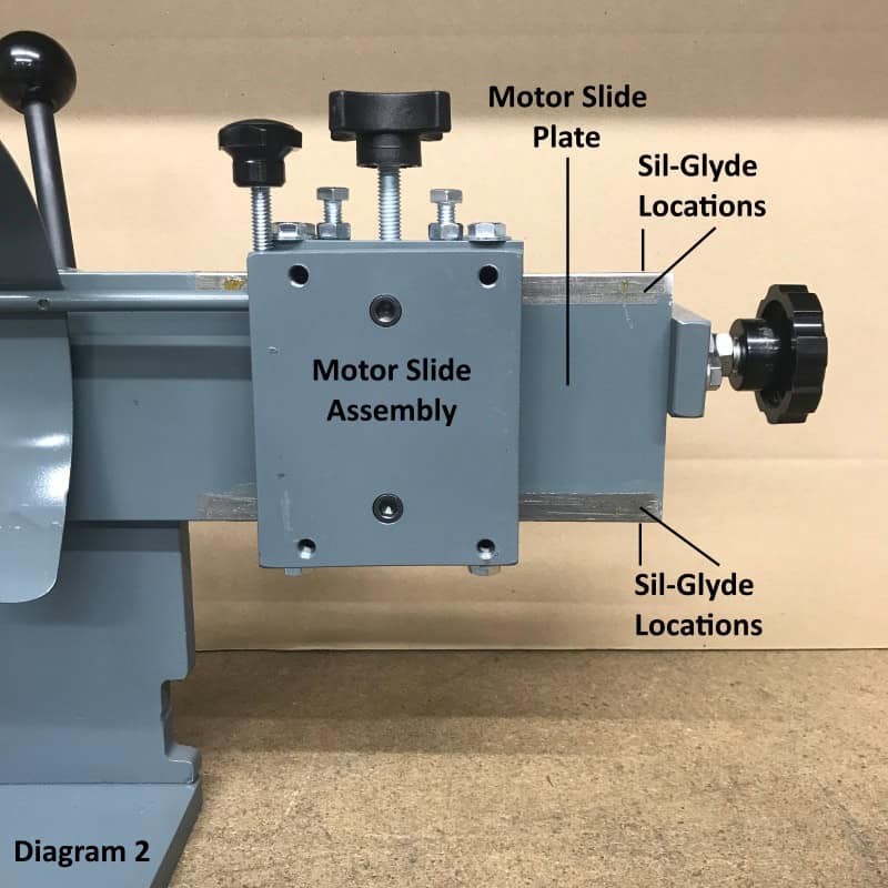 We use a thin layer of Sil-Glyde to lubricate the active moving parts in the motor slide assembly. Diagram 2 and 3 point out the locations that we lubricate when assembling the AV-40 sharpening machine. There are two main areas of lubrication maintenance. 1) In diagram 2, lubricate all unpainted surfaces on the motor slide plate. 2) Apply a very thin layer on top the 12″-13 threaded rod and travel the motor back and forth to work the lubrication into the slide block.